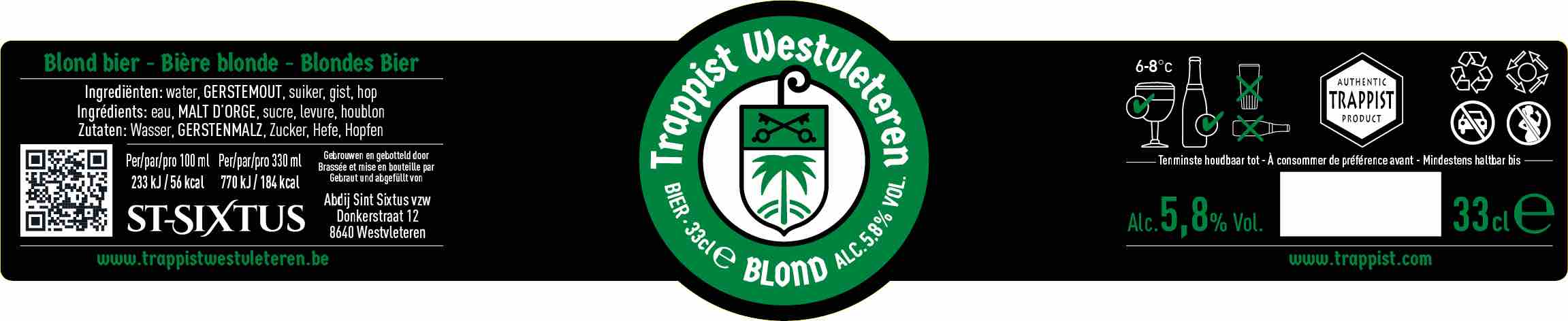 In addition to the name of the beer and the legally required information, symbols and allergens, the labels also contain the complete list of ingredients in three languages, the energy values, the logo with the coat of arms of the Saint Sixtus Abbey and a QR code that refers to a webpage with the complete nutritional table.